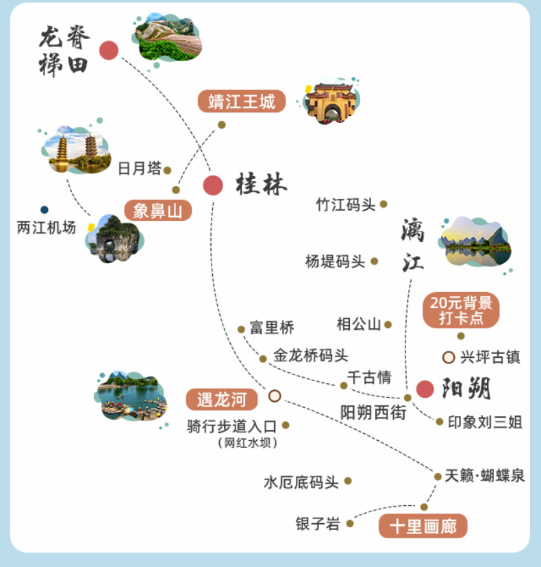 3、桂林机场距离阳朔县城大约95公里,您可乘坐公交巴士、出租车或包车前往阳朔!