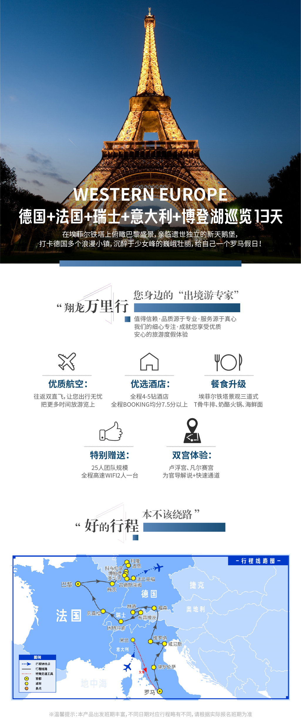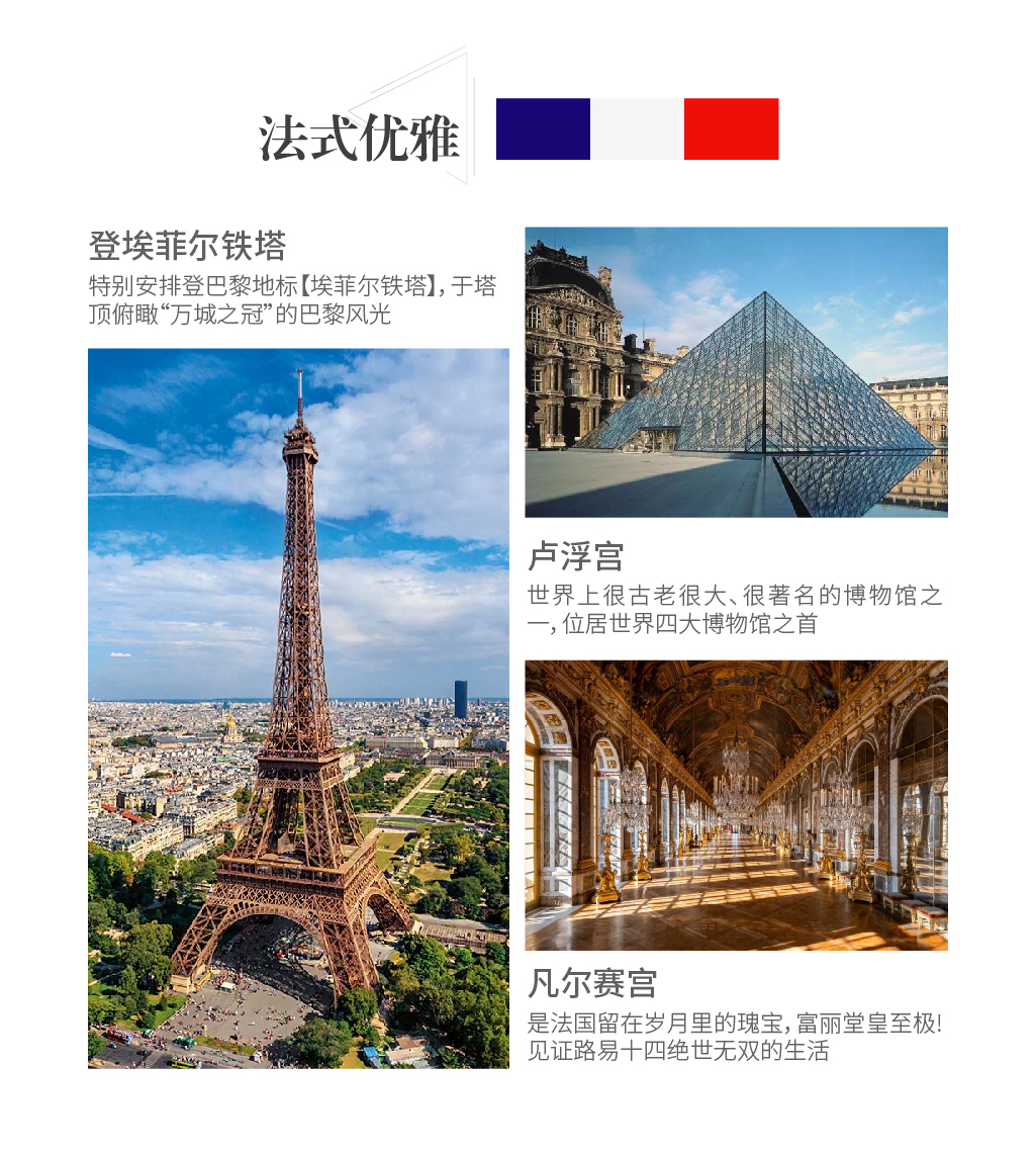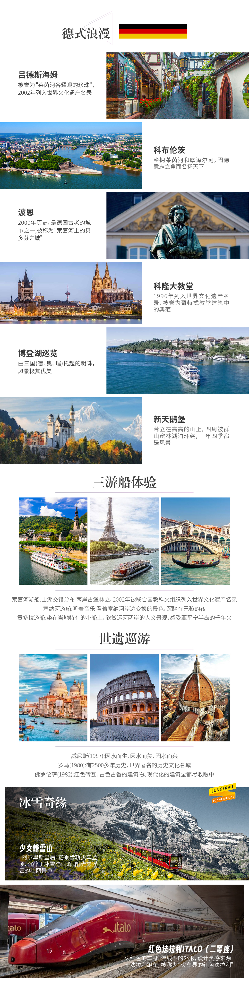产品理念:在埃菲尔铁塔上俯瞰巴黎盛景,亲临遗世独立的新天鹅堡,打卡德国多个浪漫小镇,沉醉于少女峰的巍峨壮丽,给自己一个完美的罗马假日!