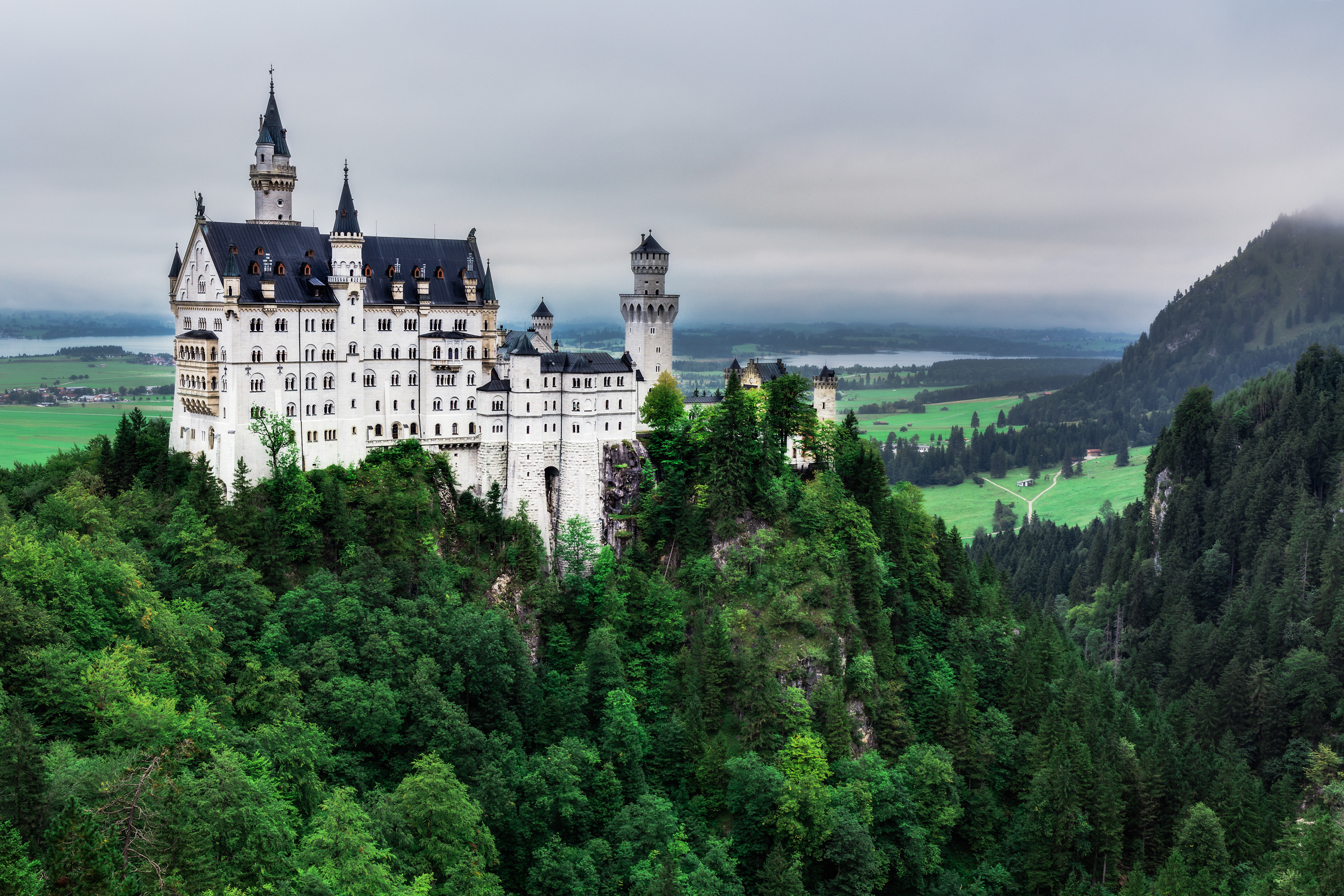 新天鹅堡:耸立在高高的山上,四周被群山密林湖泊环绕,一年四季都是风景