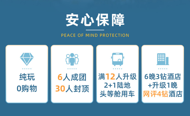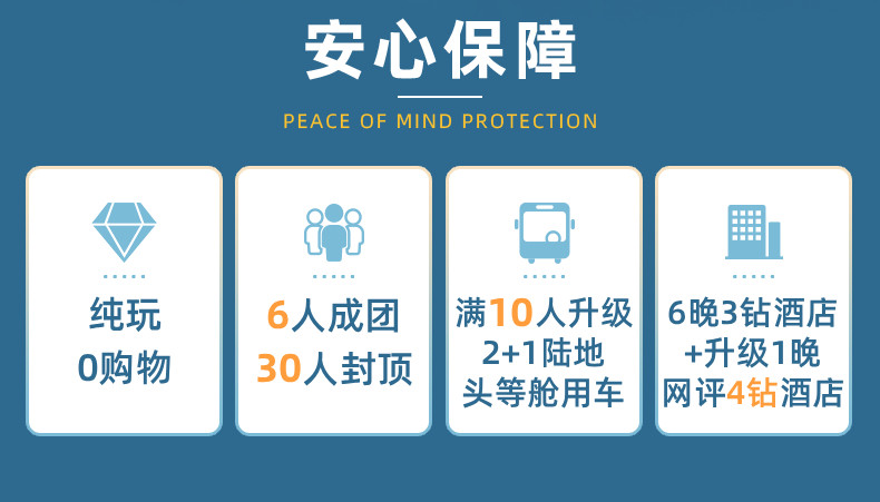 当地用车:空调旅游车(10人以上升级2+1头等舱商务车,保证一人一正座,当地接送机为普通空调旅游车)