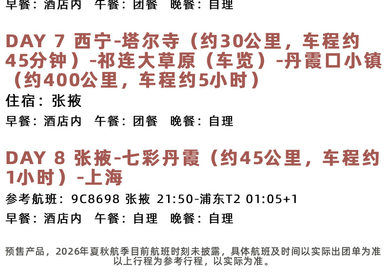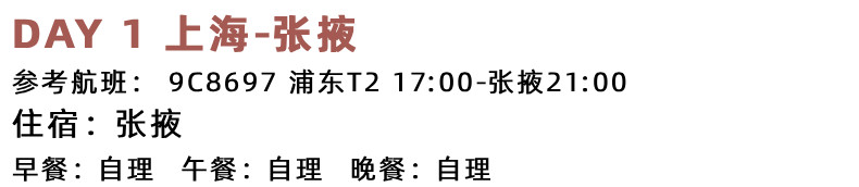 1.交通:上海-张掖 (春秋航空 经济舱往返),当地空调旅游车(10人以上升级2+1头等舱商务车,保证一人一正座,当地接送机为普通空调旅游车)