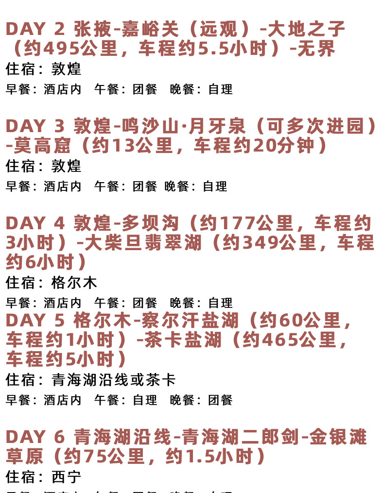 3.不含行程中所列景点小交通及自费项目,张掖七彩丹霞小交通38元/人,察尔汗盐湖景区交通60元/人 ,茶卡盐湖景区交通60元/人,塔尔寺景区交通35元/人、翡翠湖观光小火车60元/人、多坝沟小交通20元/人当地现付,以当地实际情况为准。